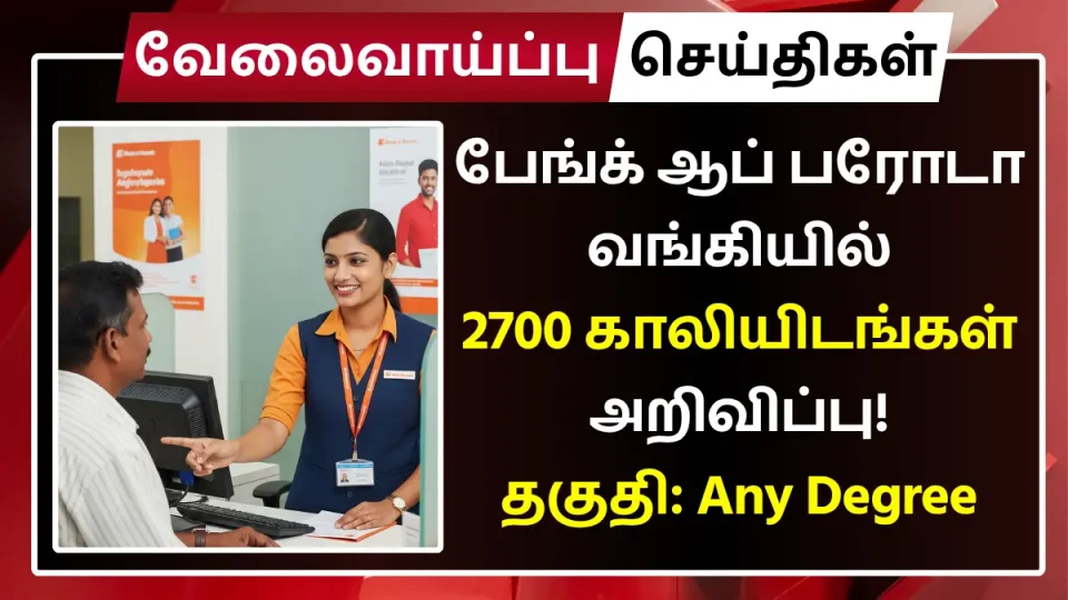 தமிழ்நாட்டில் உள்ள பேங்க் ஆப் பரோடா வங்கியில் வேலை – 2700 காலியிடங்கள் || Any Degree முடித்தவர்கள் விண்ணப்பிக்கலாம்! Bank of Baroda Recruitment 2025